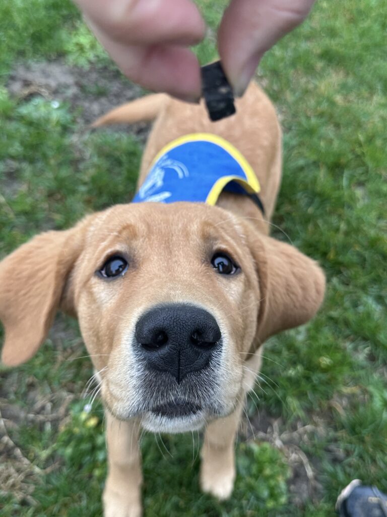 Ce rôle de famille d’accueil est absolument fondamental à ce stade de sa vie. C’est Vanessa et Sébastien qui lui inculque les règles de base : la propreté, la vie en famille, les ordres de rappel et d’obéissance, et surtout la découverte de toutes sortes de situations du quotidien. Lieux inconnus, transports, foule, bruits de la ville… autant d’expériences essentielles, car un chien guide ne doit avoir aucune appréhension dans des environnements nouveaux. Une crainte mal gérée pourrait un jour mettre en danger son futur maître.